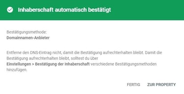 Nun gehe zurück zur Goolge Search Console und drücke den Button "Bestätigen" Wenn alles funktioniert hat so solltest du das grüne Bild sehen.