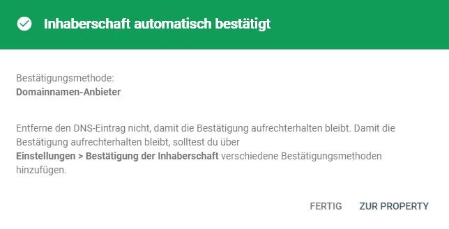 Wenn du das geschafft hast, so solltest du jetzt dieses Bild sehen. Weil jetzt musst du zu deinem Domain Anbieter gehen und deine Domaininhaberschaft über DNS-Datensatz bestätigen.